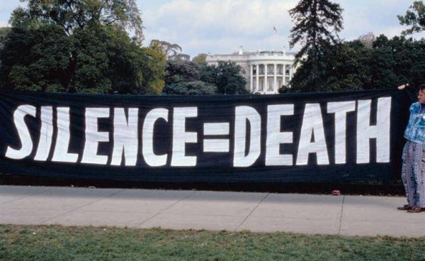 艾滋病平权联盟活动人士在白宫门口悬挂“沉默=死亡”的横幅,1992年