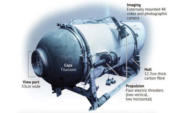 (注:潜水器和潜艇之间的区别在于后者更大且更自给自足。相比之下,泰坦是一艘小型潜水器,只有有限的补给和大约96小时的氧气。)