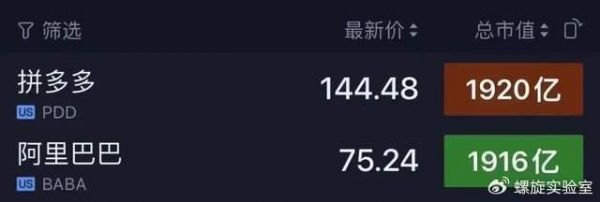 北京时间11月29日22点41分,美股拼多多股价涨超4%,市值达到1920亿美元,成功超越阿里(1916亿美元),进位成为美股市值最高的中概股。