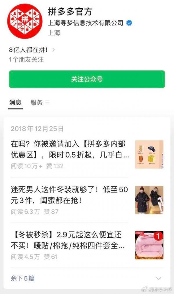 坊间曾有传言称,当年因为拼多多的这套玩法被微信封得太严重,所以拼多多一口气注册了几百个公众号当作备用,至今在微信内还能搜索到不少当初公众号“砍一刀”的“遗迹”。