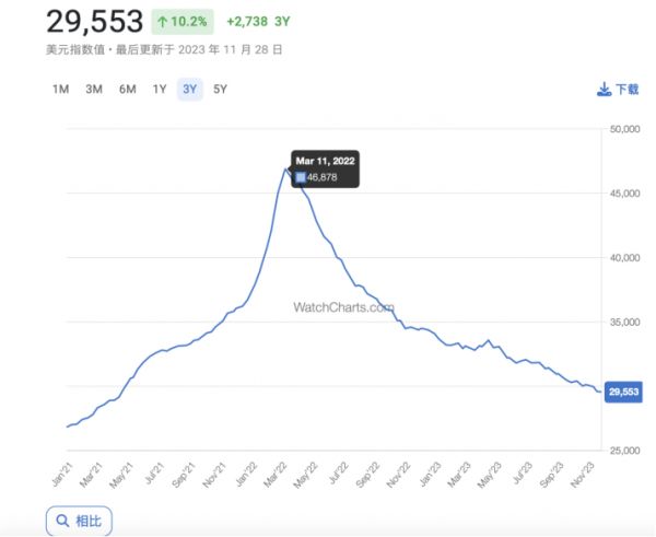 “实际上,美联储加息前夕的那一段时间才是真正的高点。”钟问分析认为。钟问曾在某连锁高端时尚百货公司担任助理总经理,在腕表行业从业十年,业余时间还运营聚焦钟表行业的个人公众号,对腕表二级市场也颇为了解。“我印象很深刻……2021年年底的时候开始涨,到了2022年的1月、2月、3月,行情有的时候一天一个价……从美联储转鹰加息和缩表,整个行情又开始破裂,很明显‘咣’地掉下来……”