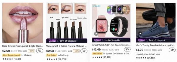 看看Temu美国站的“best sellers”(销量最高商品),哪怕是拼多多老用户都得流口水。一美元的眉笔,两美元的唇膏,4.79美元的运动鞋,12.49美元的触屏手表同时兼容安卓和iOS。