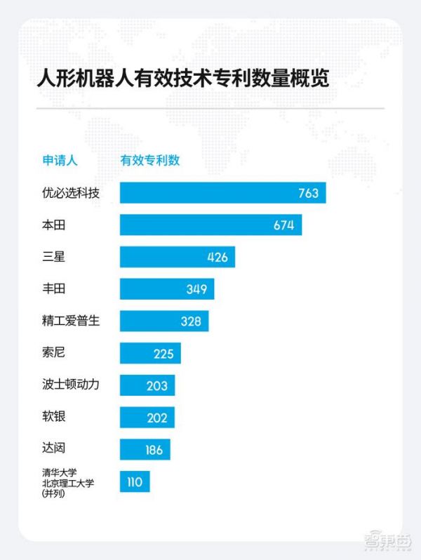 ▲《人形机器人创新发展指导意见》通知(图源:工信部官网)在这场千亿级赛道的竞争中,技术创新无疑是国内外人形机器人赛道玩家们取胜的关键。11月27日,人民网研究院发布《人形机器人技术专利分析报告》,报告指出我国已经在人形机器人有效专利申请数、专利申请数量等多方面实现了从落后到领跑,成为全球第一梯队。其中,中国企业优必选以763件人形机器人有效专利申请数排名全球第一。