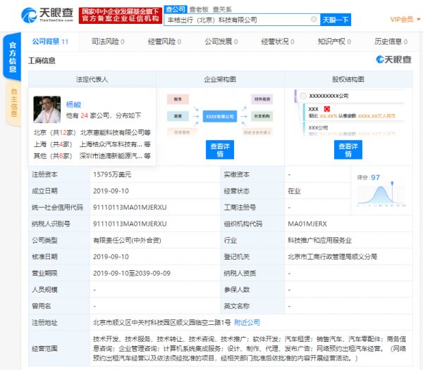 网易科技讯 9月17日消息,天眼查数据显示,9月10日,丰田、滴滴共同出资的合资公司——丰桔出行(北京)科技有限公司正式成立,法定代表人为滴滴出行副总裁杨峻,注册资本1.5795亿美元。公司经营范围包括汽车租赁;销售汽车、汽车零配件;网络预约出租汽车经营等。