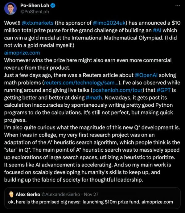 罗博深教授第一时间转推了XTX的CEO,Alex Gerko的推文来自英国伦敦的算法交易金融科技新贵,XTX Markets,正在启动一个新的价值1000万美金的挑战基金,即AI-MO,人工智能数学奥林匹克奖。