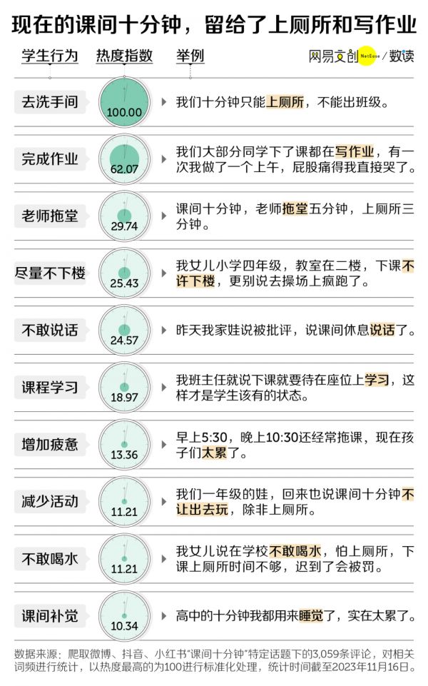 为了更好地了解学生们现在真实的课间生活,我们通过统计社交平台上相关的学生评论,总结出这届学生的课间是这样的:教室的门是尽量不要出的,楼是最好不要下的。说话会被批评,在教室外面玩要被扣分。