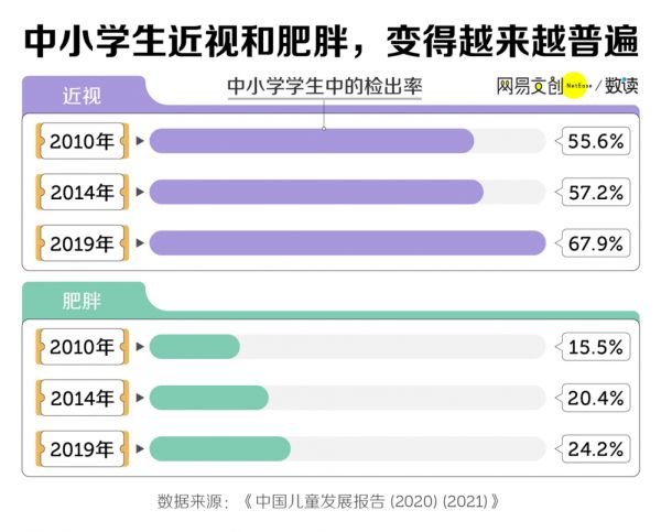 历年《中国儿童发展报告》显示,中国中小学生近视检出率已经由 2010 年的 55.6% 增至 2019 年的 67.9%。通俗来讲,就是你走在路上每碰到十个小孩,其中接近七个都是近视眼 [6][7]。更令人担忧的是,近视低龄化问题正在变得越来越突出 [8]。