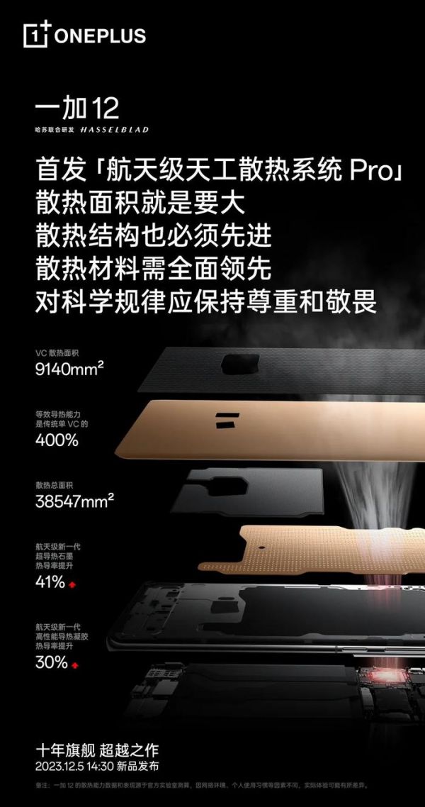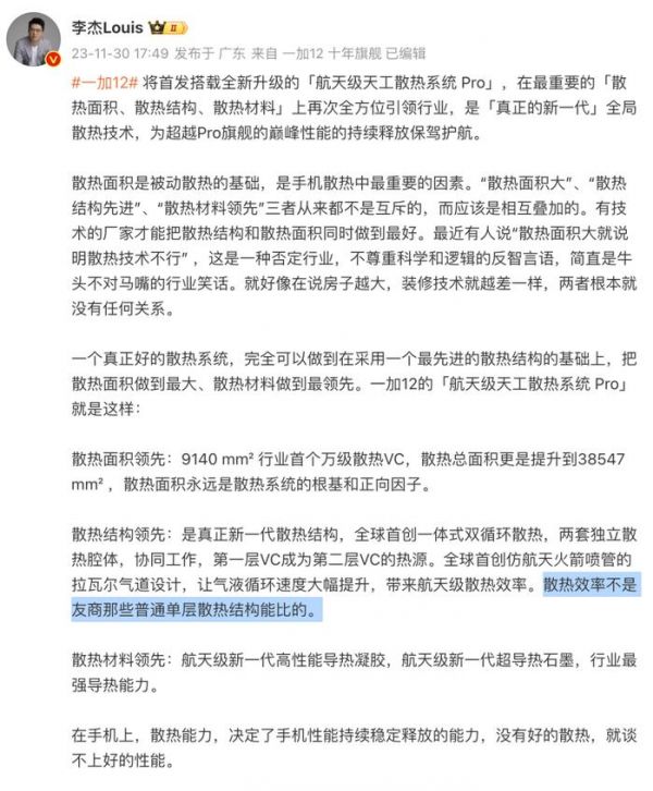“就好像在说房子越大,装修技术就越差一样,两者根本就没有任何关系。一个真正好的散热系统,完全可以做到在采用一个最先进的散热结构的基础上,把散热面积做到最大、散热材料做到最领先。一加12的「航天级天工散热系统 Pro」就是这样。散热效率不是友商那些普通单层散热结构能比的。”