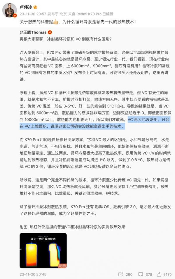 卢伟冰在宣传自家K70系列时称:“VC散热到了一定面积(5000-6000mm²)后开始衰减,Redmi用的循环冷泵散热能力大约是VC散热的三倍左右,大家以后看到谁的VC散热面积越来越大就要超过6000mm²,VC散热面积越大,越说明这家公司没技术。”(一加、红魔、真我都是万阶散热...)