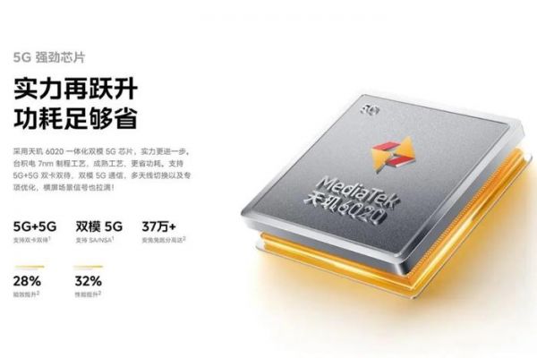 至于说手机的其他方面,处理器采用的是天玑6020,这是一个改名而来的处理器,此前叫作天玑700。它有两个2.2GHz的A76大核心和六个2.0Ghz的A55小核心,GPU是双核G57。芯片的安兔兔跑分在35万左右,是一款入门级的芯片。