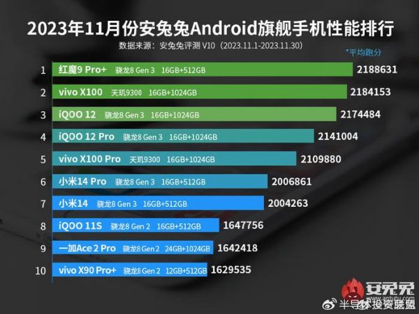 集微网消息,12月1日,性能测试平台安兔兔公布了2023年11月安卓手机跑分性能排行榜。旗舰手机中,Top5不出所料均搭载联发科、高通最新旗舰芯的智能终端,平均跑分均超过210万分,竞争激烈。其中搭载联发科天玑9300的vivo X100和有主动散热风扇的红魔9 Pro+游戏手机几乎打成平手,说明天玑9300的性能着实强大,不愧旗舰之名,从这个角度来看,天玑9300性能已经在8G3之上。