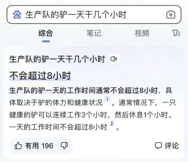“这种驴和普通生产队的驴有本质区别,给赋予了一种哲学色彩,那就是除非爆炸不然拉磨动力永不消逝,堪称西西弗驴。”伍静边向凤凰网总结边翻出另一篇帖子,上面是一张搜索“生产队的驴每天工作多少小时”的图片。