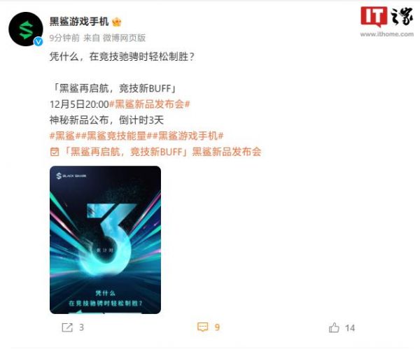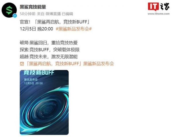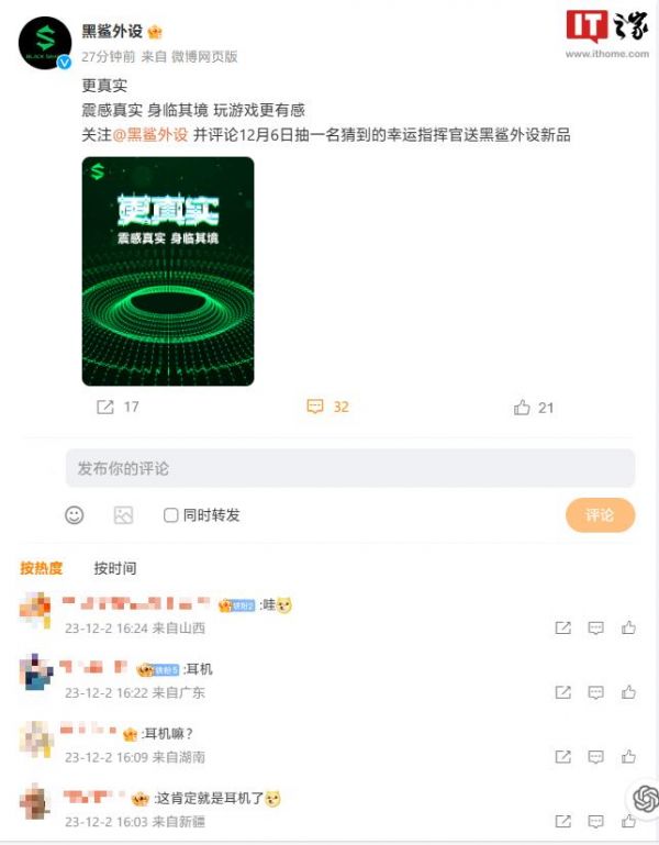 IT之家 12 月 2 日消息,继昨天黑鲨游戏手机宣布新品发布会定档 12 月 5 日 20:00 之后,@黑鲨外设 今天对神秘新品进行预热:口号为“更真实”。