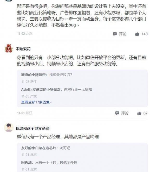 有网友调侃道:微信只有一个产品经理(张小龙),其他都是产品助理。但是懂行的网友对此表示:你说的那些是基础功能设计看上去没变,其实微信有很多基础服务的,比如微信开放平台的更新,还有目前的视频号小店等等。不少需求都是牵一发而动全身,每个需求都得几个部门评估好久才能做,不然会出bug。