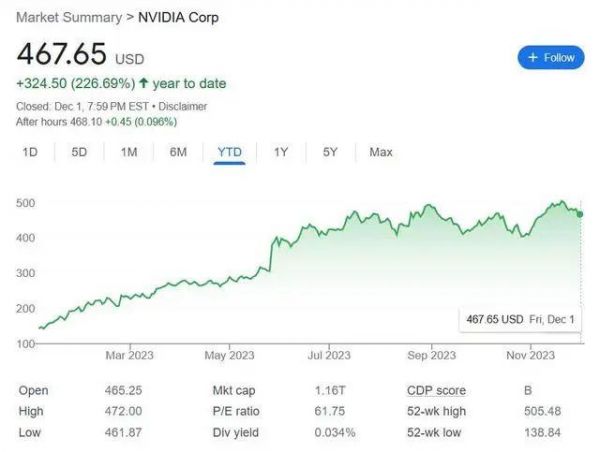 今年至今,英伟达股价上涨了226%,市值净增约8500亿美元,是标普500指数成分股中表现最好的公司。