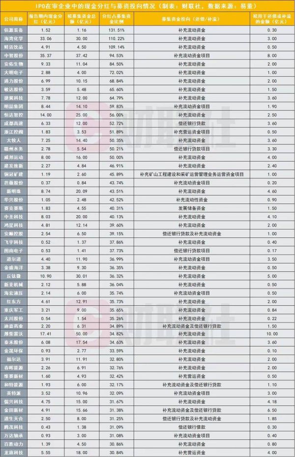 而目前在审企业中,这类“掏空式”分红现象也并不少见。据统计,目前在审企业中分红占拟募集资金30%以上,且打算将部分募集金额用来还债或补充流动性的企业共有51家。其中,有9家企业拟用于还债或补流的资金超过4亿元。