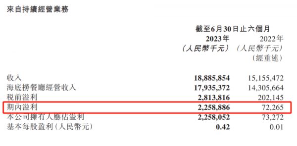 海底捞上半年盈利同比暴增30倍。(图/海底捞2023年半年报截图)