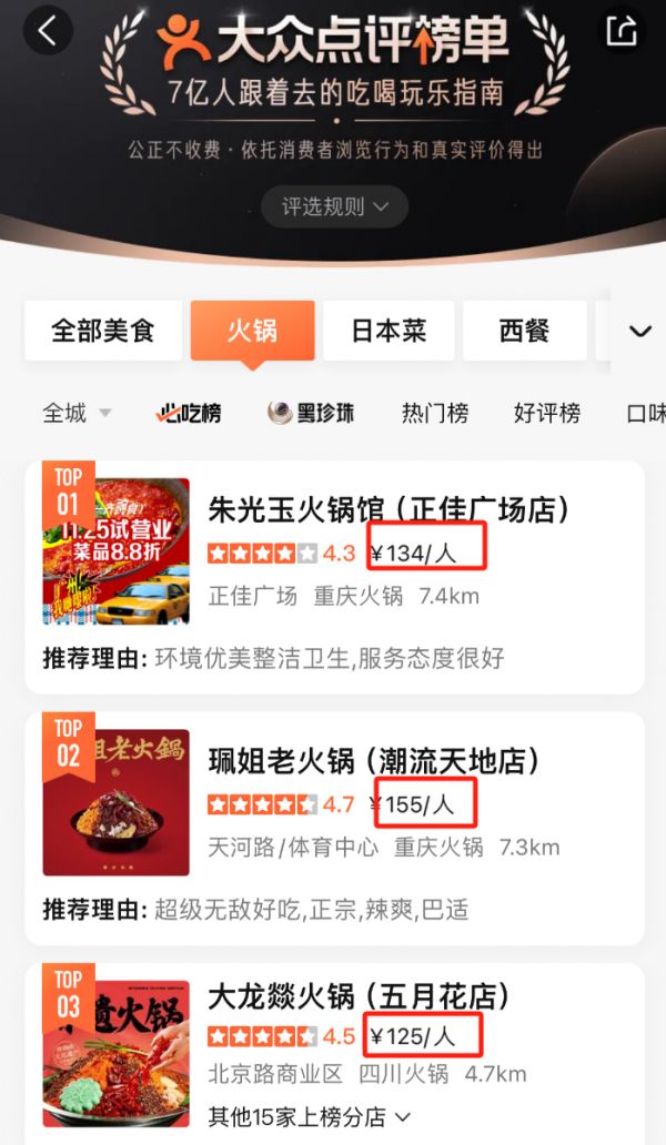 而在本地生活平台上搜索“火锅”,海底捞的人均消费也早已掉出第一梯队。