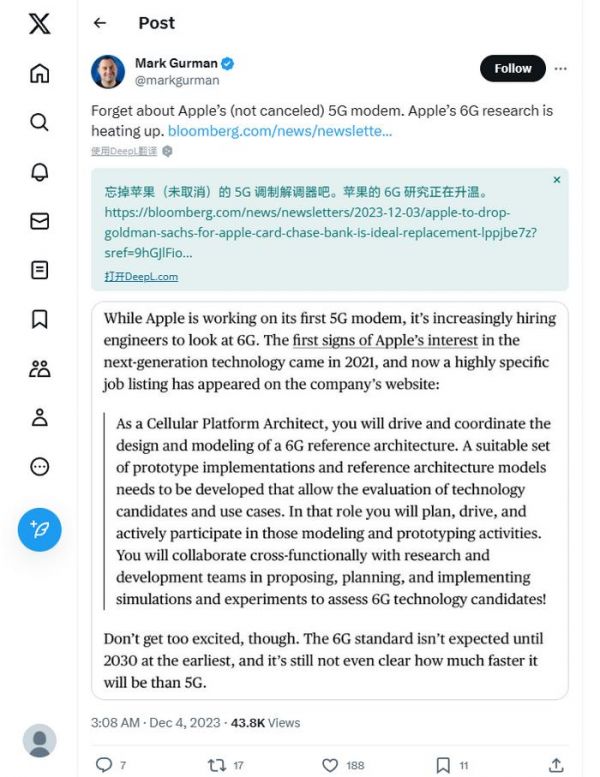 IT之家 12 月 4 日消息,彭博社的马克・古尔曼在当地时间周日发表了最新一期“Power On”,谈到了苹果对 6G 技术的研发规划。同时,他在自己的 X 推文中直言,“忘记苹果的 5G 调制解调器吧,尽管它尚未被取消。苹果的 6G 研究正在升温。”