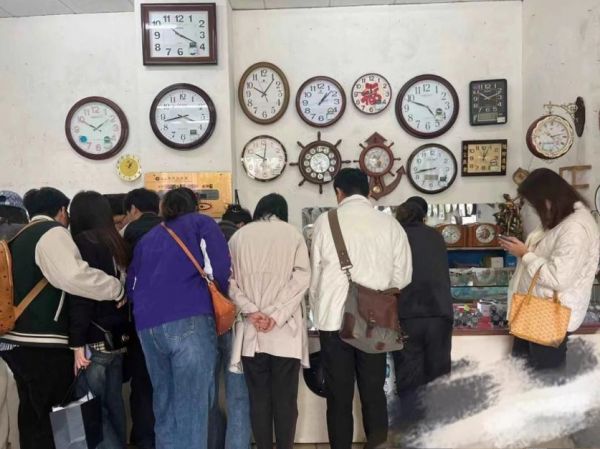黄牛也闻风而动。他们前脚在店里原价买来手表,后脚就在厂门口摆起摊子售卖,也有人在网上开直播或者挂上二手平台。原本店里80元到两三百元不等的桂花表,倒手再卖,价格就能翻上几番。