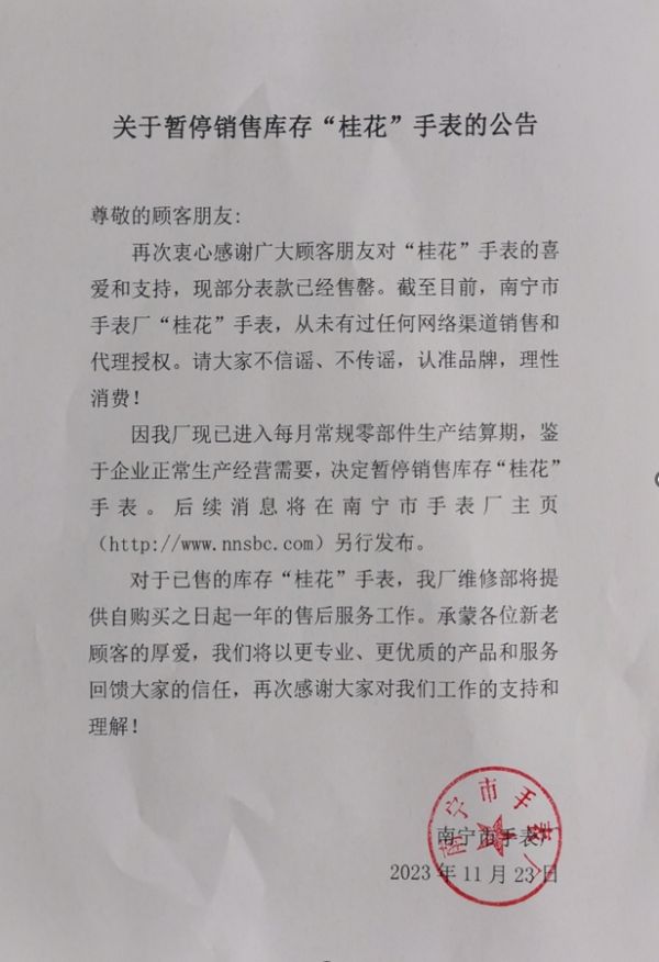 11月23日晚,南宁市手表厂发布公告表示,“桂花”手表部分表款已经售罄,同时因工厂现已进入每月常规零部件生产结算期,鉴于企业正常生产经营需要,决定暂停销售库存“桂花”手表。