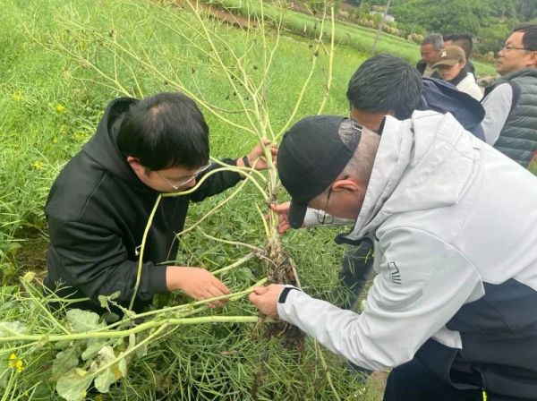 ▲4月24日,刘胜祥(右一)带领 团队在湖北郧西县城关镇油菜地里 查看病虫害情况。