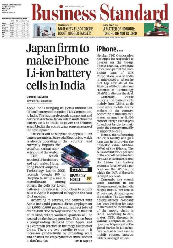 不过,TDK 和苹果均未回应有关合作的询问。10 月中旬,TDK 公司领导团队成员、公司官员在印度会见了该国电子和信息技术部的高级官员,讨论了这项交易。据业内人士估计,印度设备制造商每年为进口电池耗费的外汇高达 55 亿卢比(IT之家注:原文为₹5500 crore,5500 个千万,当前约 4.71 亿元人民币)。