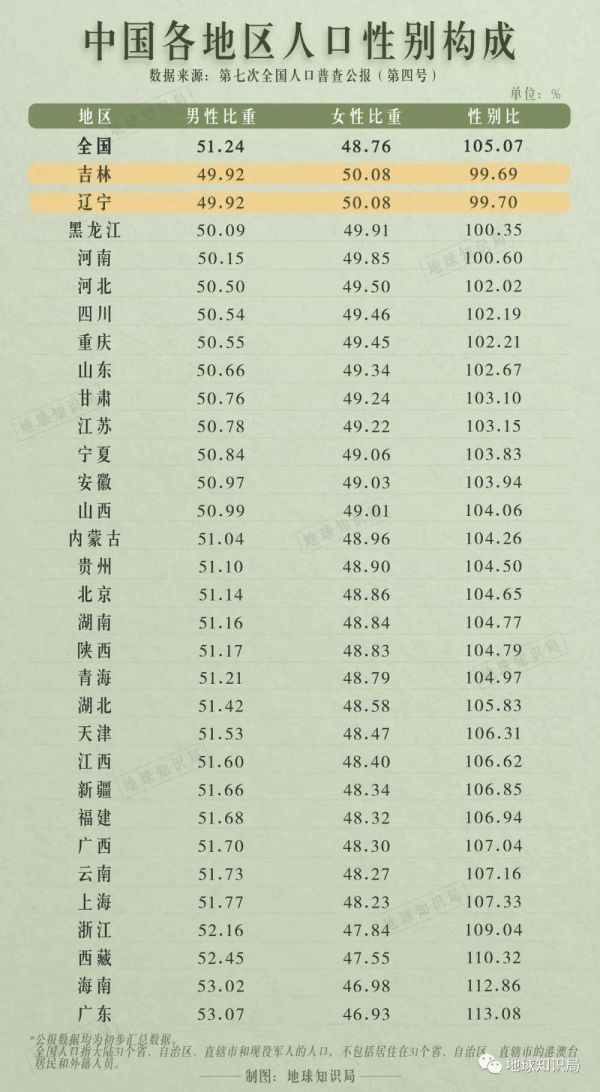 根据第七次全国人口普查统计,辽宁、吉林两省分别以99.70、99.69的性别比,成为了中国内地仅有的女多男少的省份。其它省份性别比均高于100,广东更是达到了全国最高的113.08,这意味着广东每有100名女性就有113名男性。