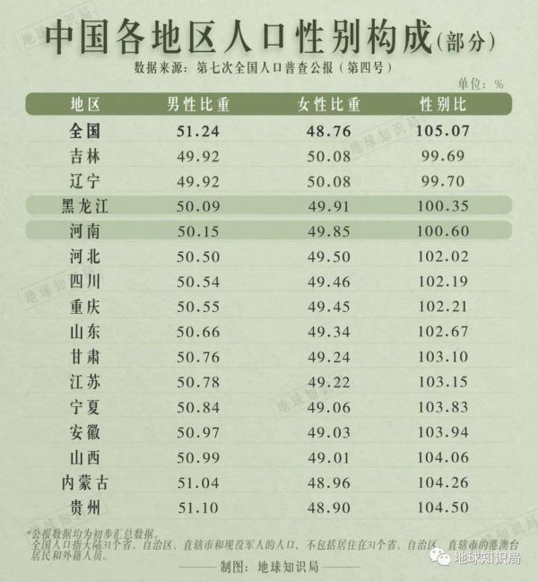 黑龙江(100.35)、河南(100.60)两省,男性人口仅仅略高于女性,处于性别比下降的第二梯队,很可能在下一次人口普查中进入性别比例低于100的省份行列。