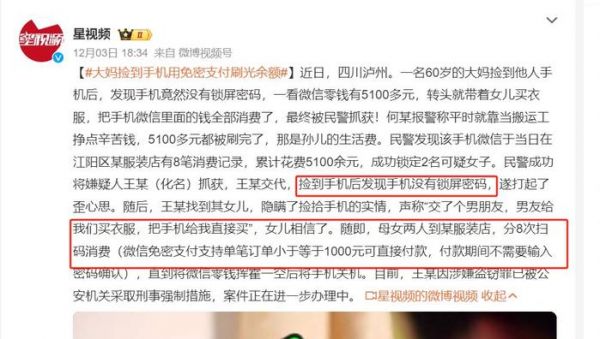 具体怎么个事呢?这位大妈捡到的这部手机,没有锁屏密码,然后她看到微信还有零钱5100元,并且开通了免密支付(小于等于1000元金额,可以不输入密码直接付款),于是就分8笔在服装店将这笔钱花完了,然后够大妈因涉嫌盗窃罪被抓捕。
