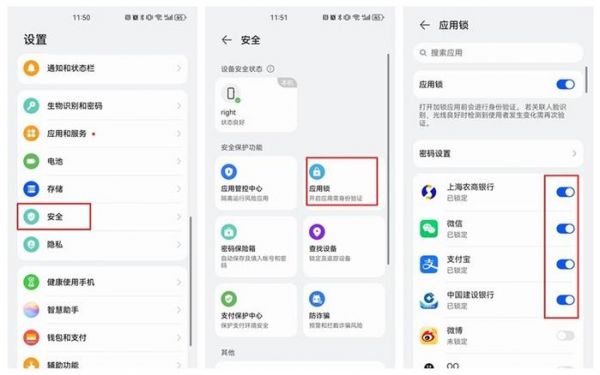 除了以上两个方法以外,还有一个更方便、安全的方法! 可以通过给应用加上“应用锁”的方式来保障应用安全。以华为手机为例,手机设置-安全-应用锁,将微信、支付宝、手机银行等涉及隐私安全的应用均加入安全锁。