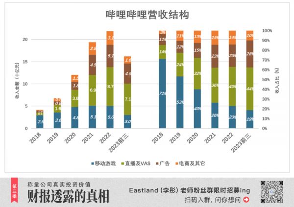 移动游戏占营收的比例从2017年的83%降至2022年的23%,再到2023年前三季的19%。原因很简单:一方面是移动游戏行业进入存量竞争阶段,增速放缓;另一方面是B站直播、广告、电商快速成长。