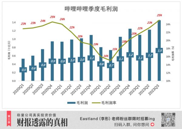 B站毛利润率呈周期性波动,2018年20.7%、2019年17.6%;2020年23.7%、2021年20.9%;2022年17.6%、2023年前三季度23.4%。