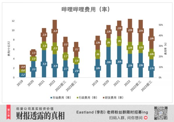 2023年,B站调整了策略,前三季度总费用下降12.6%,总费用率46.6%,同比减少8.2个百分点。在营收保持增长的情况下(同比增长2.7%),经营亏损下降了55%。