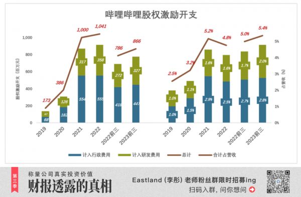 2022年前三季度,B站费用率大幅下降,但股权激励开支不降反升,达8.7亿、同比增长10%,占营收的5.4%;其中4.5亿计入行政费用、3.3亿计入研发费用。