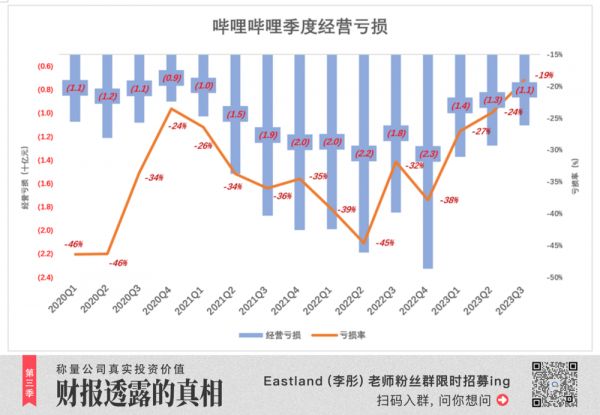 进入2023年,B站画风突变,经营亏损逐季下降,Q3亏损11亿、亏损率首次降到20%以下。