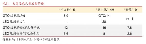 不同型号火箭的发射价格