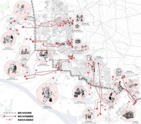 通过远程工作、网络社交等信息技术支持,加之更为便捷的物理交通系统,人们可以选择居住于村镇,并享受村镇的闲适环境、激发村镇特有的节庆、手工艺等地方文化,同时并不和城市生活“相距太远”。(制图:郑时翔、盖溦)