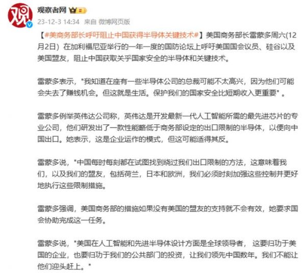 但就是如此正常的商业行为,依然遭到了美国商务部的阻止,甚至英伟达在近日还遭到了美国商务部长雷蒙多的点名批评。