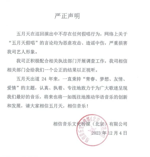 舆论发酵之后,五月天的经纪公司相信音乐在12月4日回复称“没有假唱”。并发布了官方声明,表示“不存在任何假唱行为,正在积极配合相关执法部门开展调查工作。”