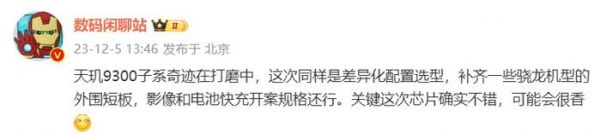 据博主 @数码闲聊站 今日爆料,小米 Redmi 新机正在测试天玑 9300 处理器,这次同样是差异化配置选型,补齐一些骁龙机型的外围短板,影像和电池快充“开案规格还行”。虽然该博主并未透露这款新机的具体型号,从产品规格来看,预计为 Redmi K70 Ultra(至尊版)手机。