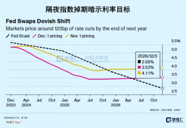 市场也心领神会,从过去是否要加息已经转变为什么时候降息的预期了。从最新市场预期显示,美联储最早可能在明年三月开始降息,明年将至少降息125基点。
