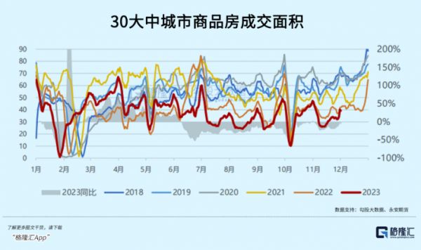 第二,不再相信经济的“长期故事”。其中,最核心的还是房地产市场。据永安期货,上两周30大中城市商品房成交环比均有回暖,但同比2022年仍然是下滑的,且处于多年来同期最低水平。