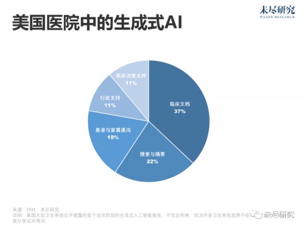 今年以来,美国至少有20家综合医疗系统,公开披露过正在试点生成式人工智能。这些应用几乎主要面向临床医生提供服务,作为他们的助手,在接诊过程中,捕获与患者的对话,自动记录符合规范的电子病历,供医生审阅;搜索病人的既往病史与检查结果、最新的临床指南手册、符合条件的临床试验机会等;对即将接手的护士,给出注意事项摘要;向患者解释报告上的术语,叮嘱按时按量服药;还可以生成转诊、出院文件,或者报销相关的文件。