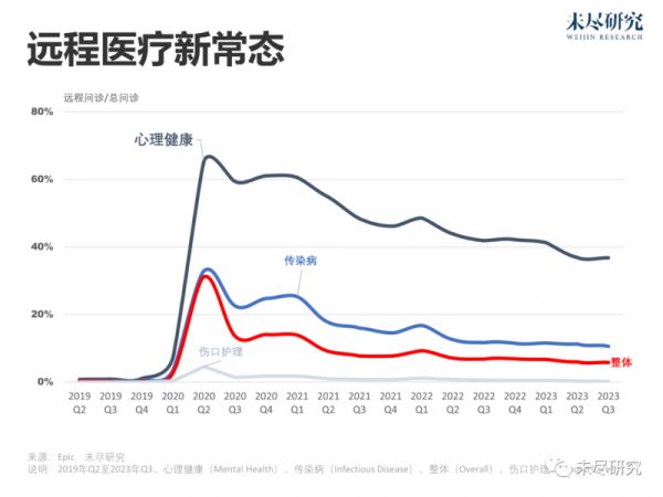 远程医疗已经进入新常态,这是大流行时代的技术遗产;愿意尝试远程医疗的用户,将成为“医生助理”智能体的基本盘。Epic公司分析了近18个季度的4.75亿次就诊记录,发现虽然热度远不及大流行初期,但整体仍有6%的问诊需求留在网上,远超大流行前的0.2%。尤其是心理健康护理,以及一些小病、慢性病与常规处方的补充等。