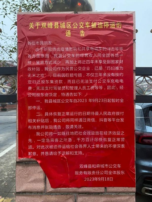 56岁的朱清吉用“窝囊”形容自身处境,不过他和同事们用另一种方式夺取了外界关注。就在两个月前,双峰县和森城市公交车服务有限公司(以下简称“和森公司”),公开发布了停运通告。理由是,因巨额亏损无力支撑运营。红底白字的通告贴在20几辆公交车的前门旁,随车穿梭于县城街道。