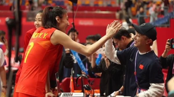 时矛在亚运会上与女排队员击掌。 受访者供图