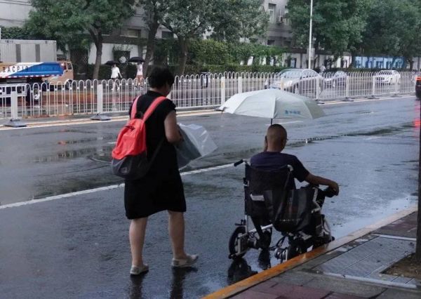 李金瑛和儿子走在雨中