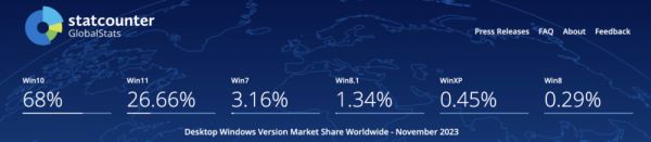 放眼全球桌面操作系统市场,就 Windows 版本应用而言,其碎片化情况太过严重,早在 2001 年推出的 Windows XP 在历经 22 年的迭代之后,仍然占据一席之地,根据知名分析机构 Statcounter 网站数据统计显示,其市场份额还有 0.45%。
