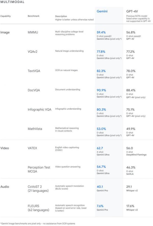 根据谷歌给出的基准测试结果,Gemini 在许多测试中都表现出了“最先进的性能”,甚至在大部分基准测试中完全击败了 OpenAI 的 GPT-4。